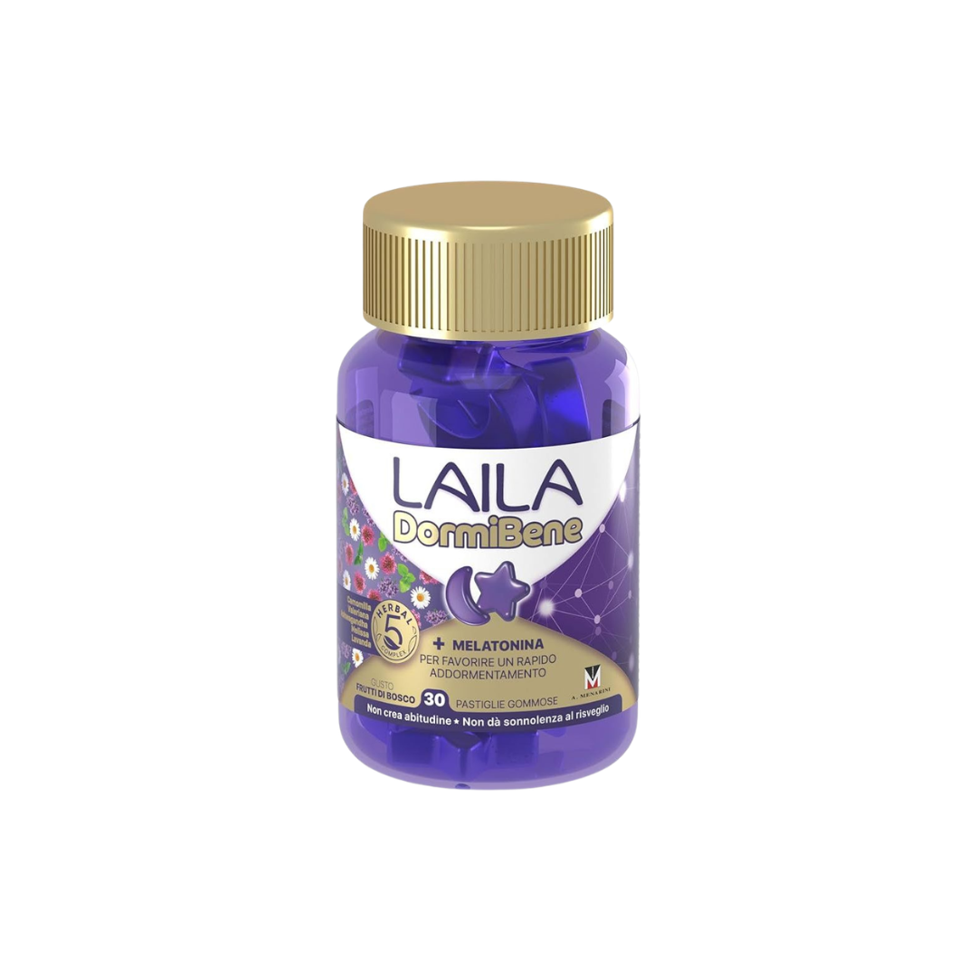 Sciroppo di glucosio, saccarosio, acqua, gelatina (suino); regolatore di acidità: acido citrico; valeriana (Valeriana officinalis L.) radice estratto; colorante: concentrato di bacche di sambuco, lavanda (Lavandula angustifolia Miller) fiori estratto, camomilla (Matricaria chamomilla L.) fiori estratto; antiossidante: E300; piridossina cloridrato (vitamina B6); melatonina; aroma: aroma naturale; agente di rivestimento: E903.
